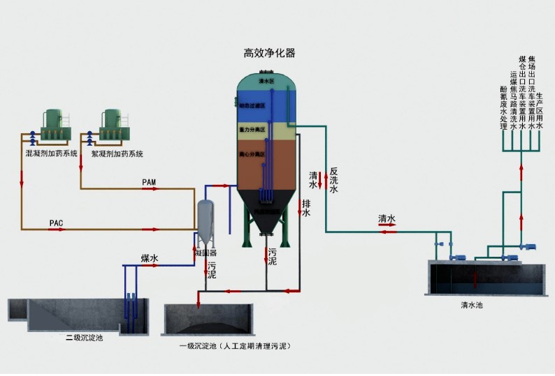 高效旋流多級(jí)污水凈化器是利用旋流閃混、常壓旋流、二級(jí)旋流離心分離、紊態(tài)造粒污泥層過(guò)濾、流態(tài)過(guò)濾的原理,將污水凈化中的混凝反應(yīng)、離心分離、泥層過(guò)濾、動(dòng)態(tài)過(guò)濾、污泥濃縮等處理技術(shù)有機(jī)組合集成在一起,在短時(shí)間內(nèi)完成高濁度廢水的多級(jí)凈化,實(shí)現(xiàn)了快速連續(xù)高效處理,出水可達(dá)到回用及排放標(biāo)準(zhǔn)。
