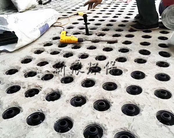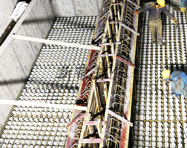 這是因?yàn)檎w澆筑ABS濾板立體綁扎鋼筋和池壁的預(yù)埋鋼筋左右能成網(wǎng)狀結(jié)構(gòu)和濾梁的預(yù)埋鋼筋上下形成立體結(jié)構(gòu),極大的提高了濾板整體荷載力和抗沖擊力。這是小塊預(yù)制濾板的預(yù)埋螺栓無(wú)法實(shí)現(xiàn)的。在曝氣生物濾池中濾料層的填充高度往往高達(dá)4m,因此荷載要高于給水中的濾池。